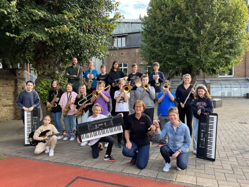 Schlagzeug, Posaune, Saxophon, Trompete, E-Bass, Keyboard oder Querflöte – damit sind nun 19 Schülerinnen und Schüler der Jahrgangsstufe 7 ins neue Schuljahr gestartet! Als viertes Hauptfach konnten sie zwischen Französisch, Biologie, Sozialwissenschaften und nun auch Musik wählen. Ähnlich wie das Fach Technik (ab Jg. 8) ist Musik ein praktisches Fach und das bedeutet natürlich: Ein Instrument erlernen und in einer Band gemeinsam spielen!